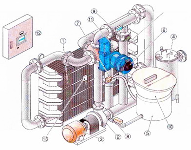 矽藻土可逆式過濾機的構造包括:毛髮捕捉器,助劑罐,循環水泵,五通閥,儀表,配管,電器櫃等設備。我公司還提供游泳池循環水的其它設備,如:消毒器,熱交換器,監測儀器等。