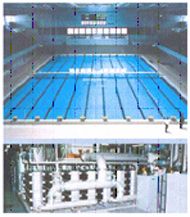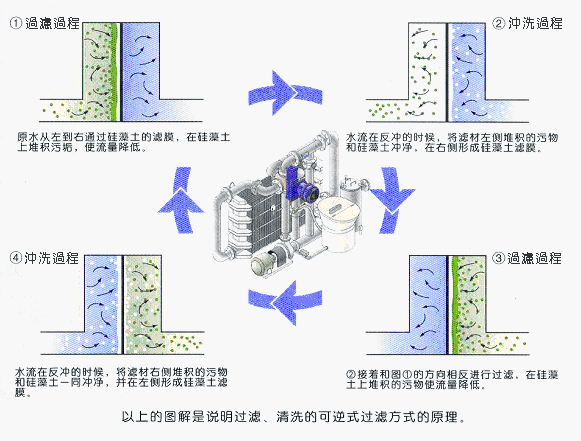 矽藻土可逆式過濾機是與日本三浦化學株式會社合作生產的國際級游泳池水處理設備,是目前游泳池循環過濾的理想設備;其過濾能力為10m3/hr-500m3/hr。該設備採用矽藻土作助濾劑,用結構獨特的五通閥完成塗膜過濾,沖洗轉換。該機具的過濾技術先進、產品性能穩定、品質可靠,並且操作維修簡單、體積小、重量輕,節省佔地面積和空間、節省能源、運轉費用低等優點;過濾精度可達到0.001-0.003mm;能濾除大腸桿菌、藻類和0.001mm以上的固體懸浮物。